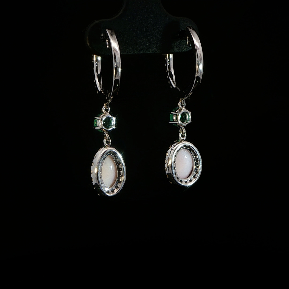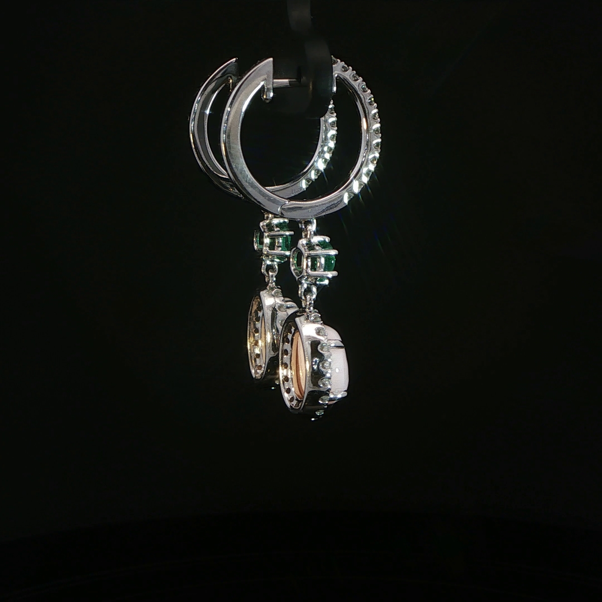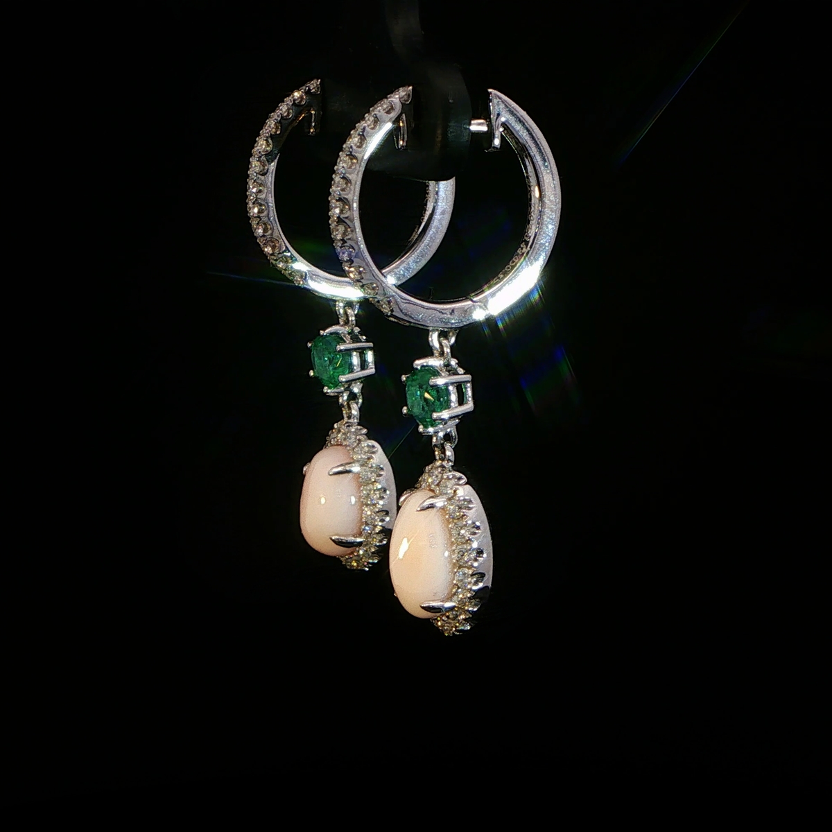 Conch pearl, emerald & diamond dangle earrings