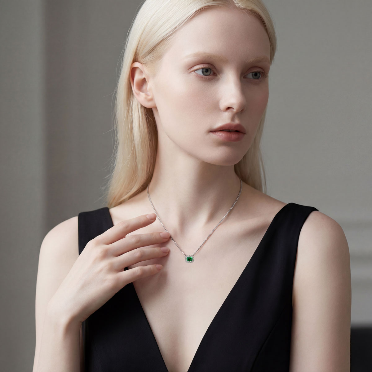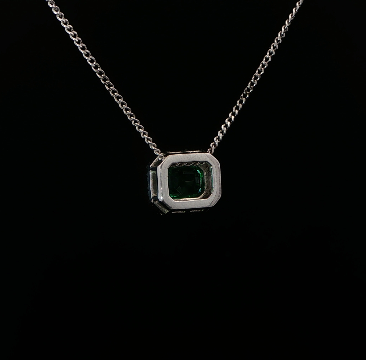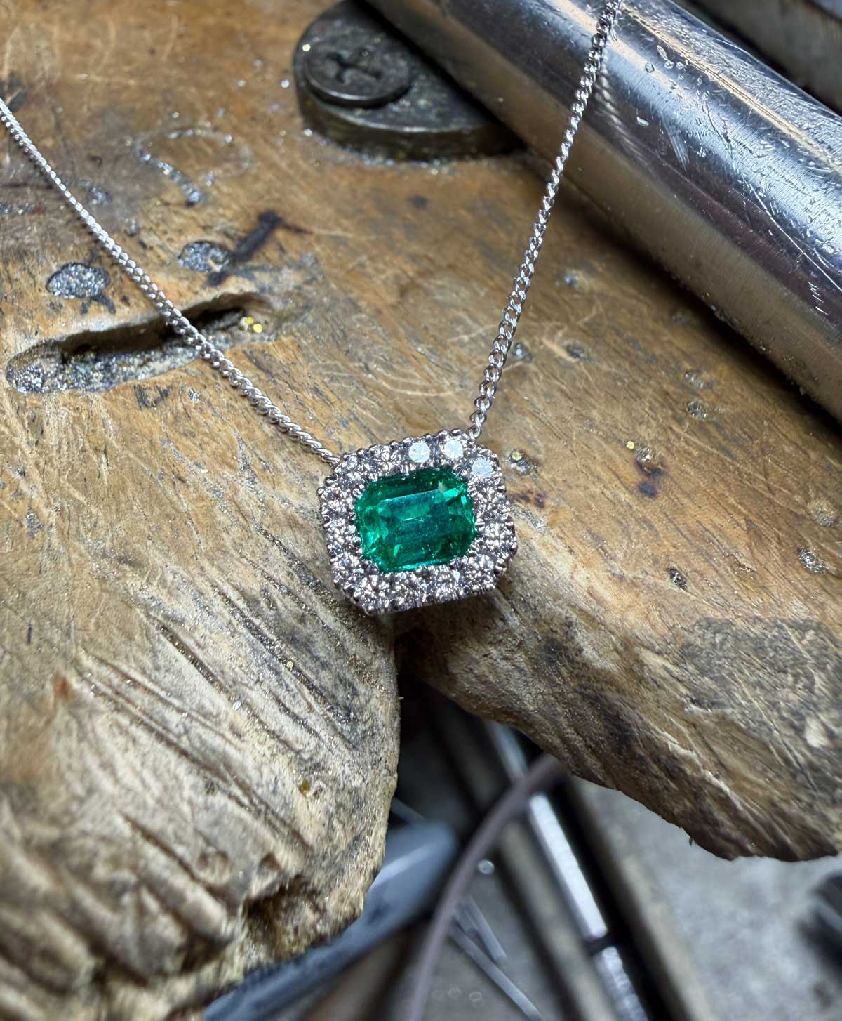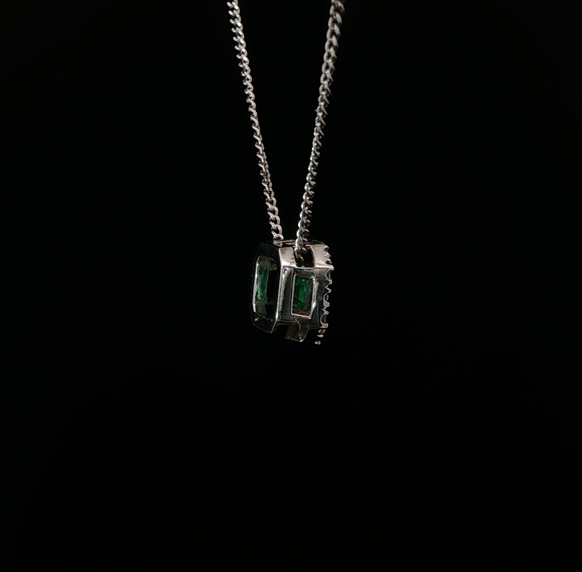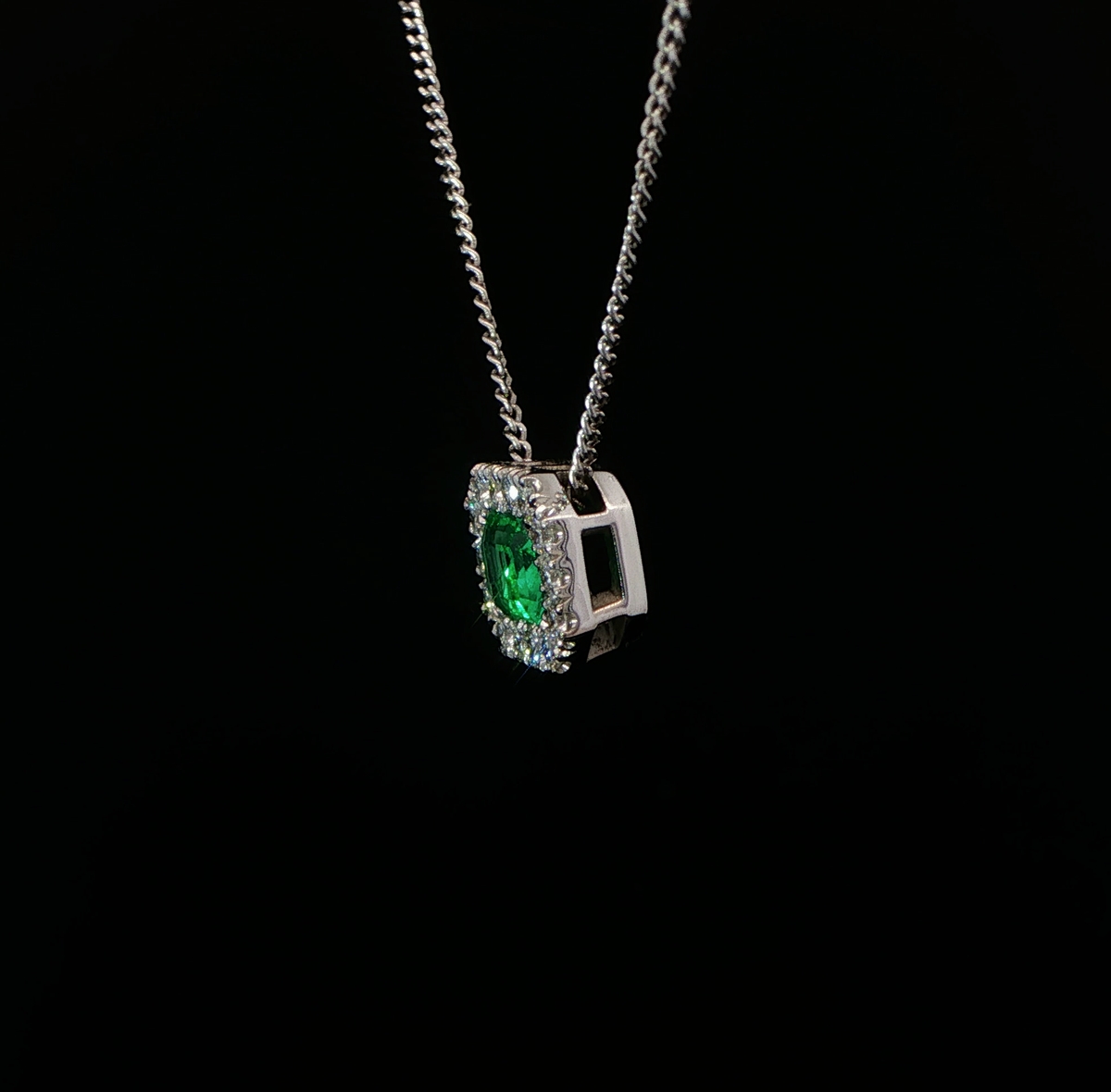 Emerald cut emerald & diamond halo pendant & chain