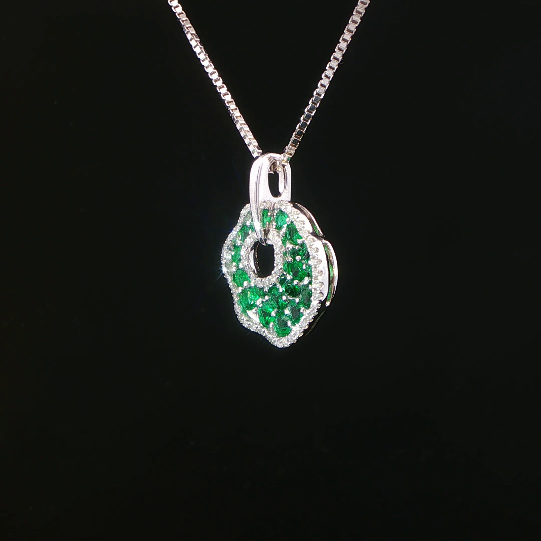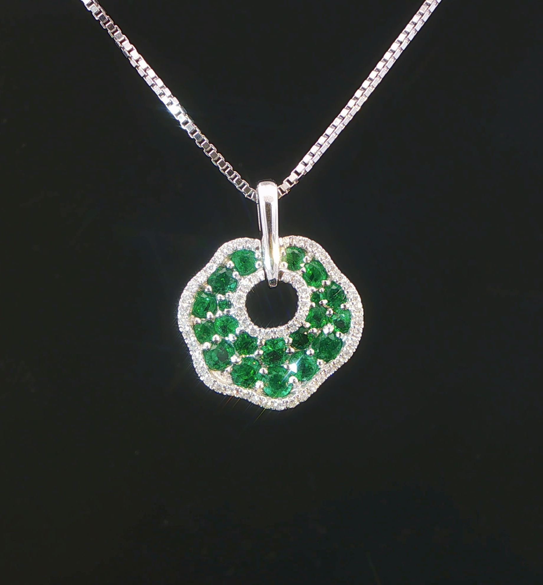 This stunning cluster pendant features exquisitely matched fine Zambian emeralds with precision cut round brilliant diamonds artfully set in 18KT white gold that makes a bold statement and conversation piece! Chain sold separately.