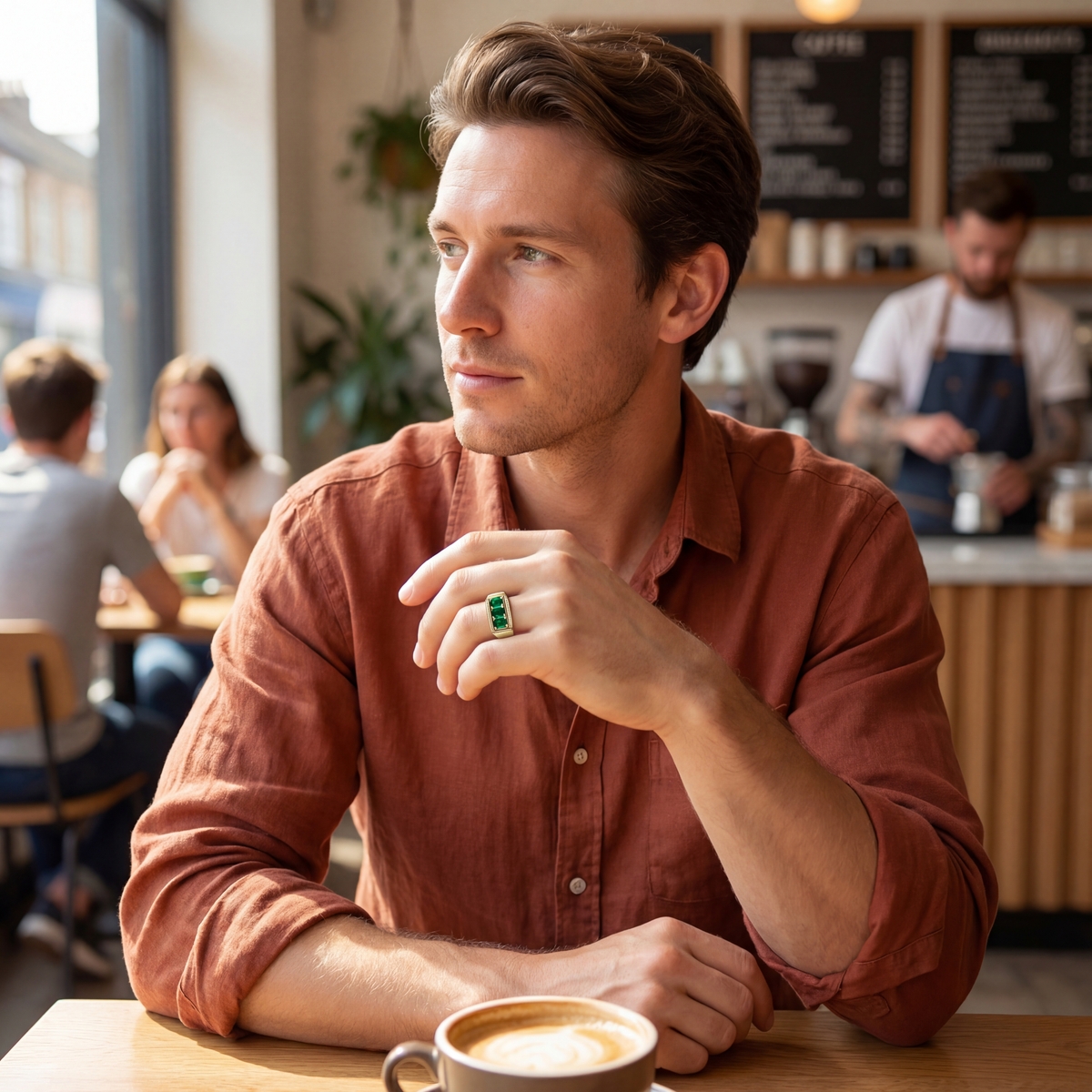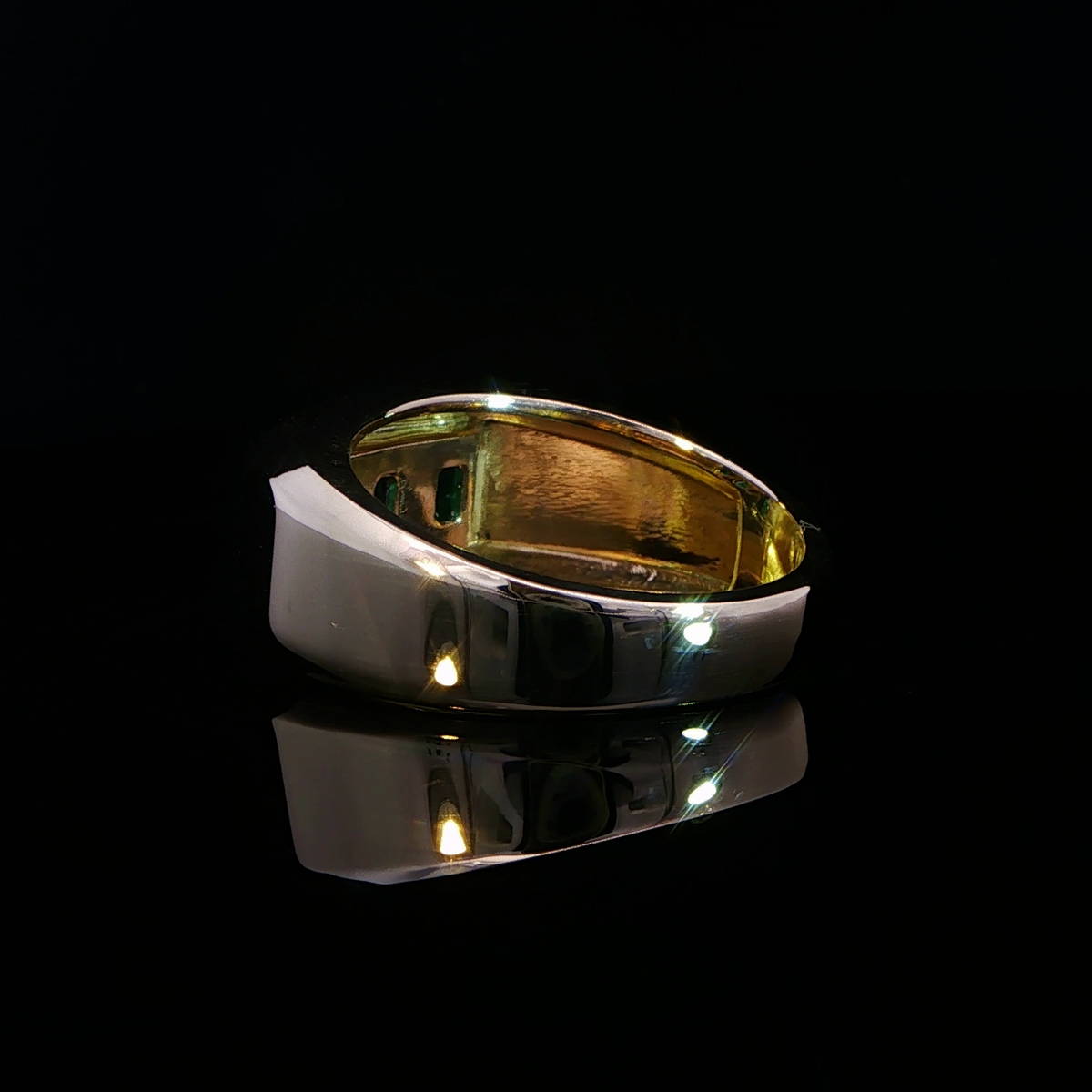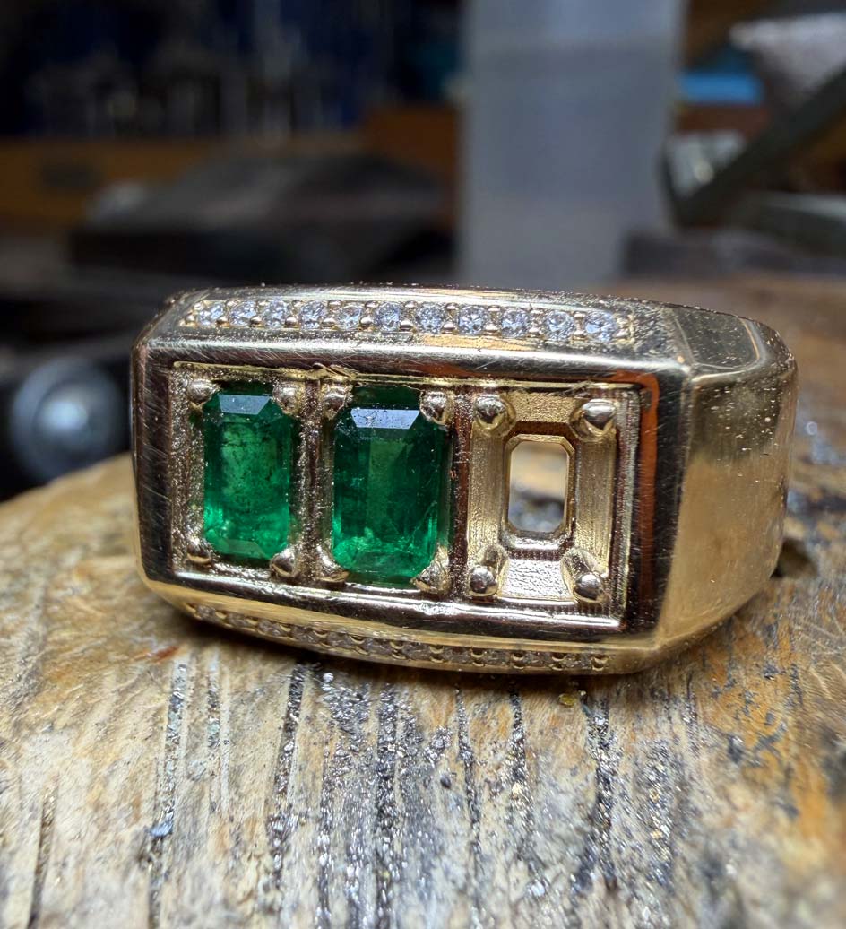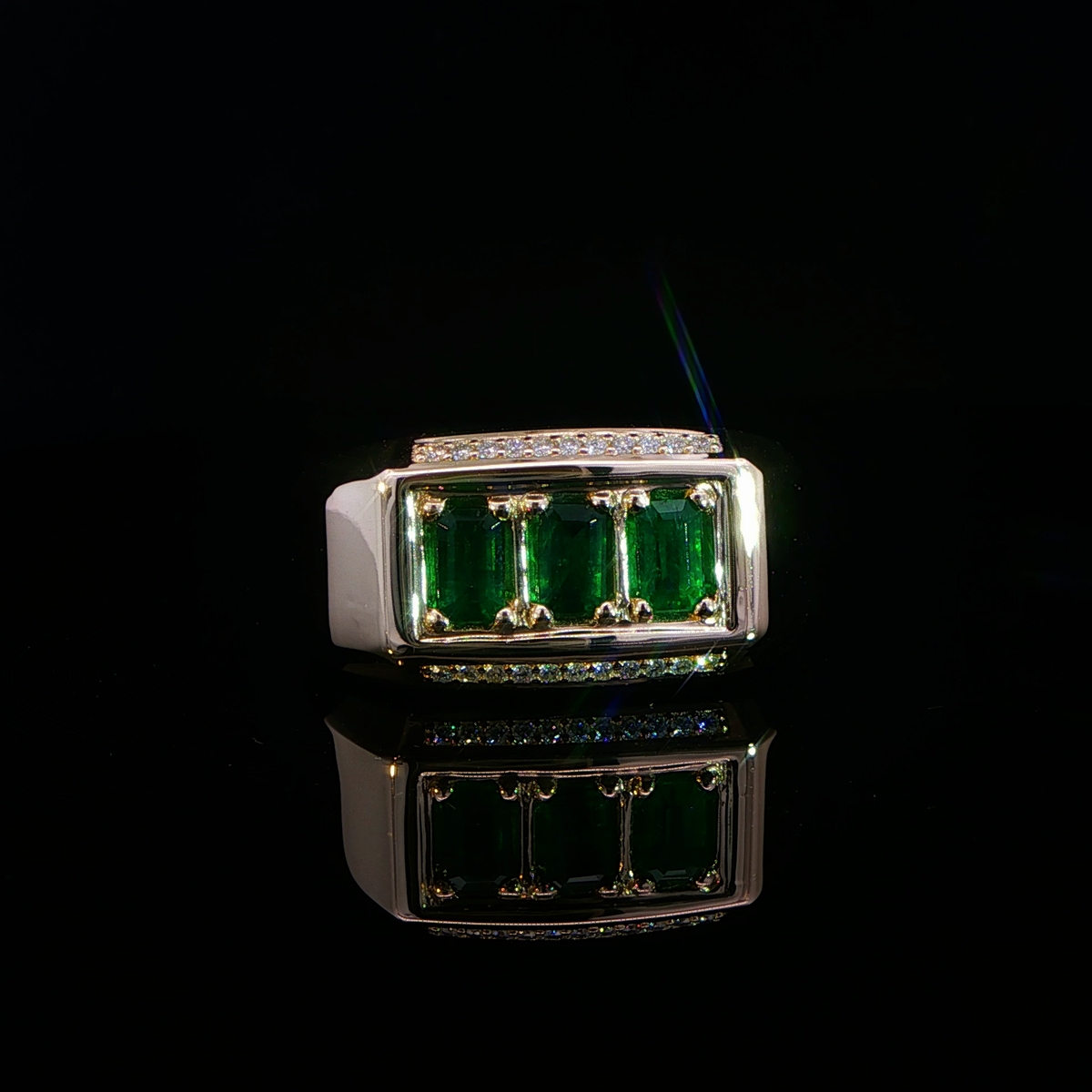 This eye-catching man’s 3 stone emerald ring features 3 beautifully matched rich, fiery emerald cut emeralds accented with a row of round brilliant diamonds on either side of the emeralds for a touch of elegance. Whether it’s for the boardroom or that special day, or just because he deserves it, this gorgeous ring makes a statement! Free sizing, shipping and lifetime exchange. Backorders ship in 3-4 weeks.