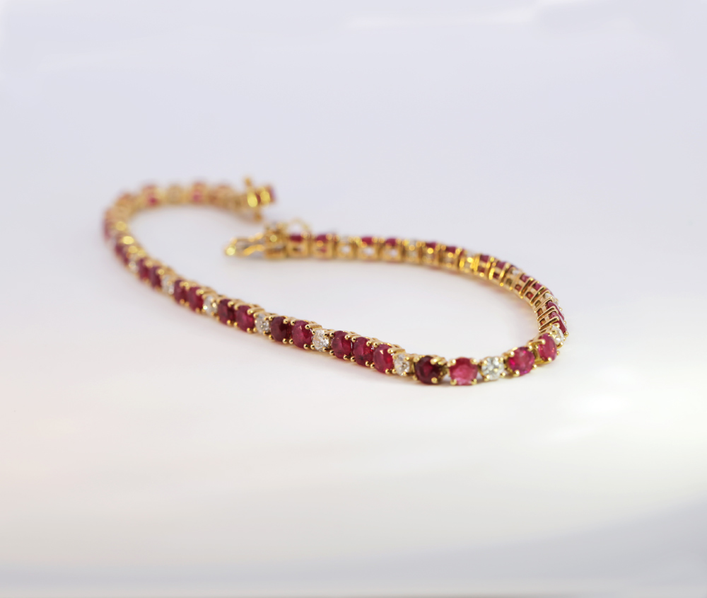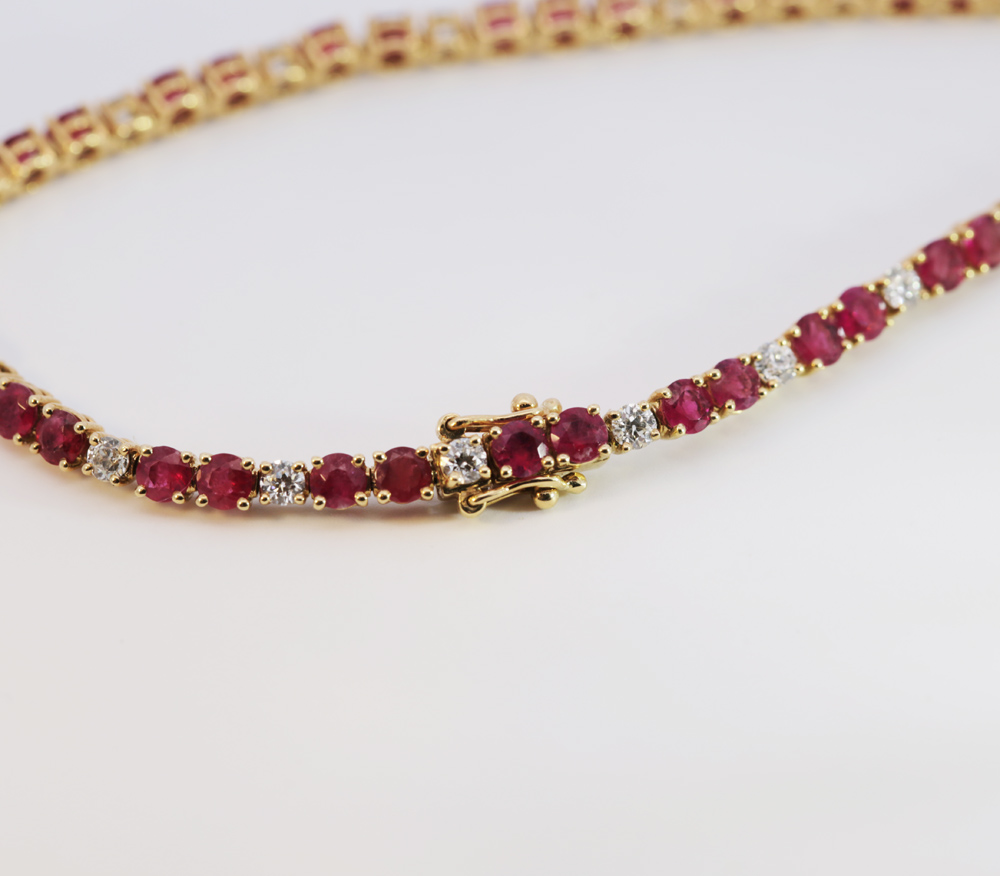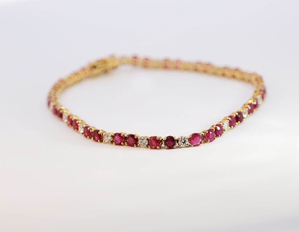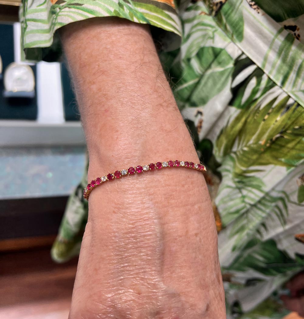 This tennis style bracelet features a fabulous matching suite of super-rare round-cut American red beryl gems paired with round brilliant diamonds in 18KT yellow gold with double safety 8 catch. Elegant everyday wear or for a night out on the town! Free shipping and lifetime exchange.