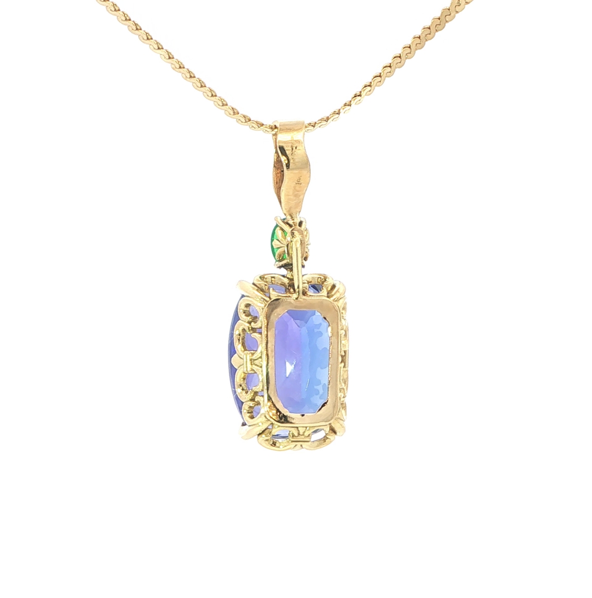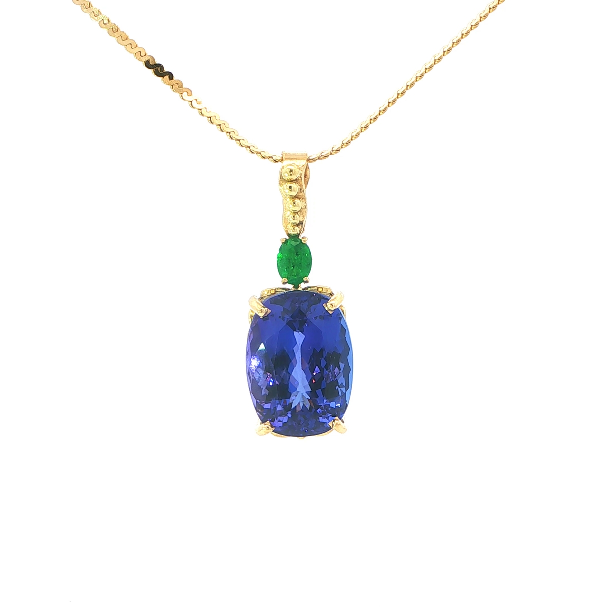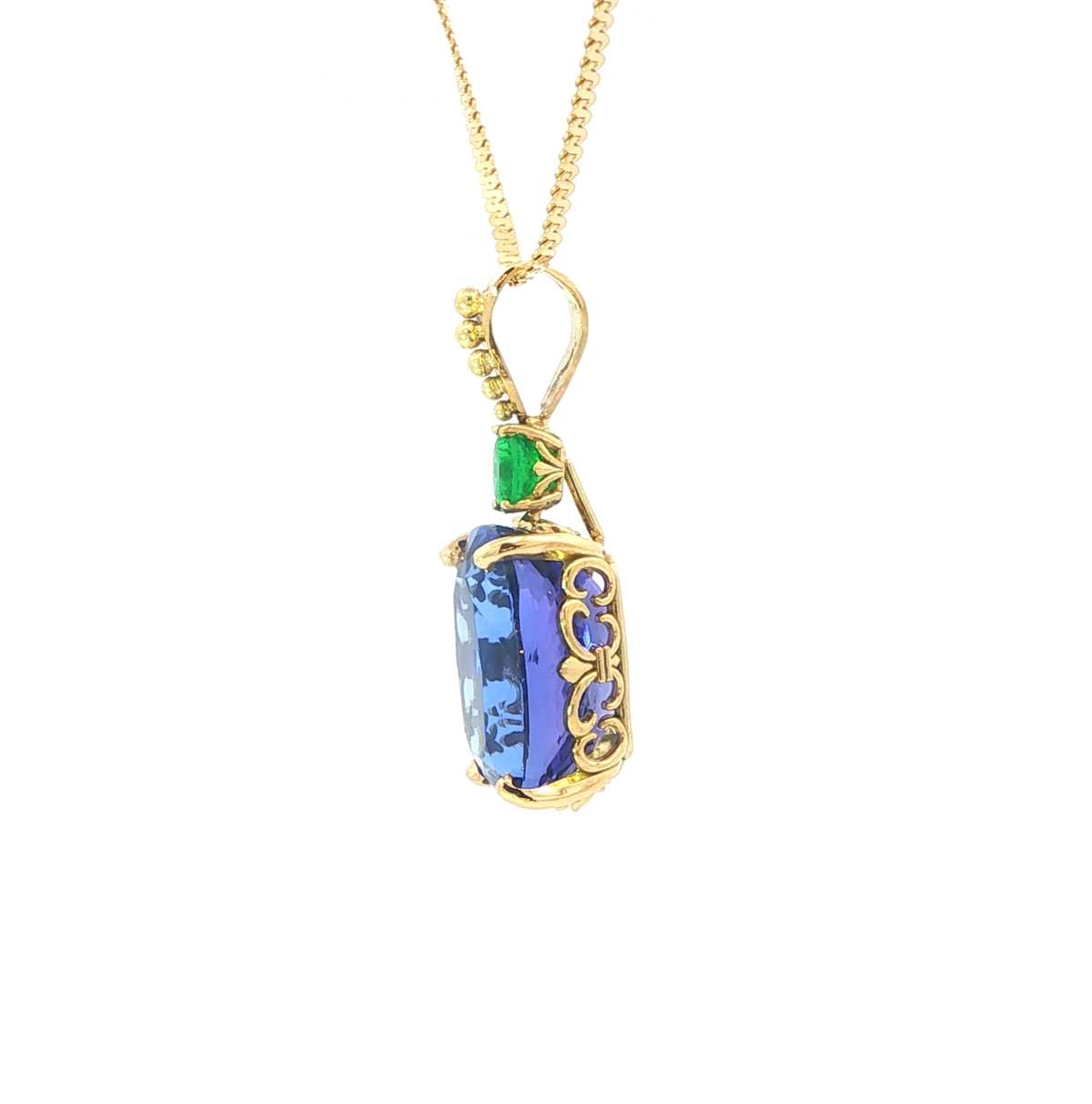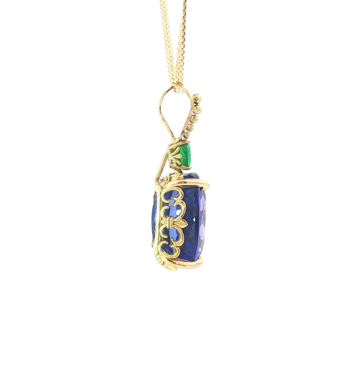 This fabulous pendant by Marcial de Gomar features a gorgeous cushion cut Tanzanite accented with a rich green fiery oval shape Colombian emerald set in an 18KT yellow gold scroll design. A real statement piece of vibrant colors and elegance! Chain sold separately. Free shipping.